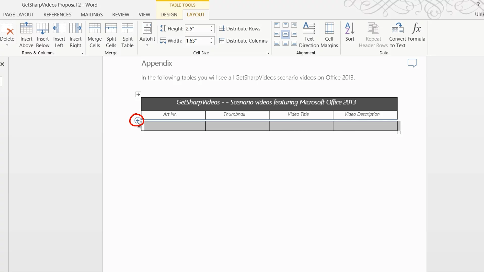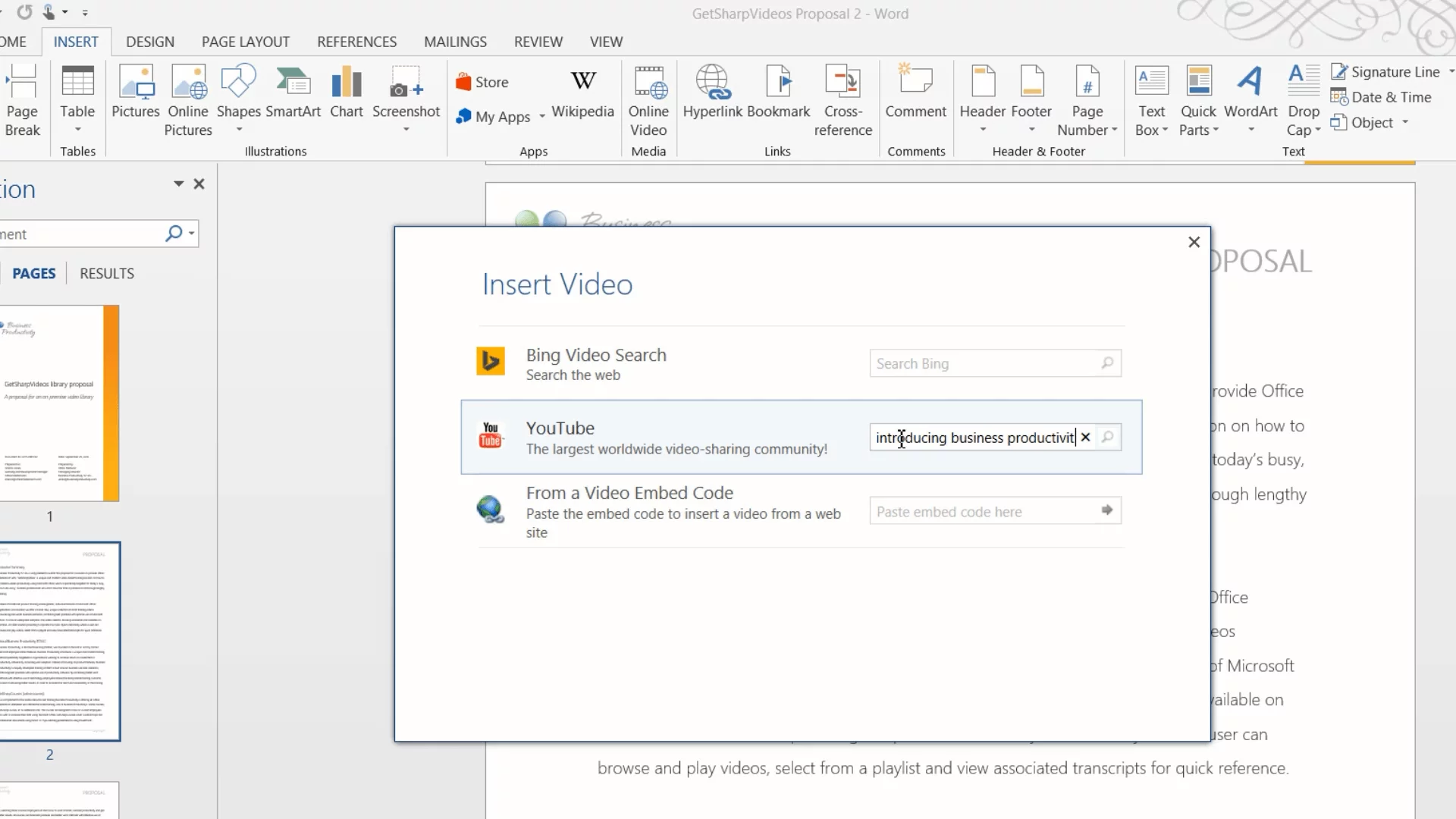 On the first page of the proposal, I’d like to add a richer introduction to our company by inserting a corporate video that we have on YouTube. To insert an online video into your document in Word 2013, go to the “INSERT” tab and click “Online Video”. Here you can search various video services.