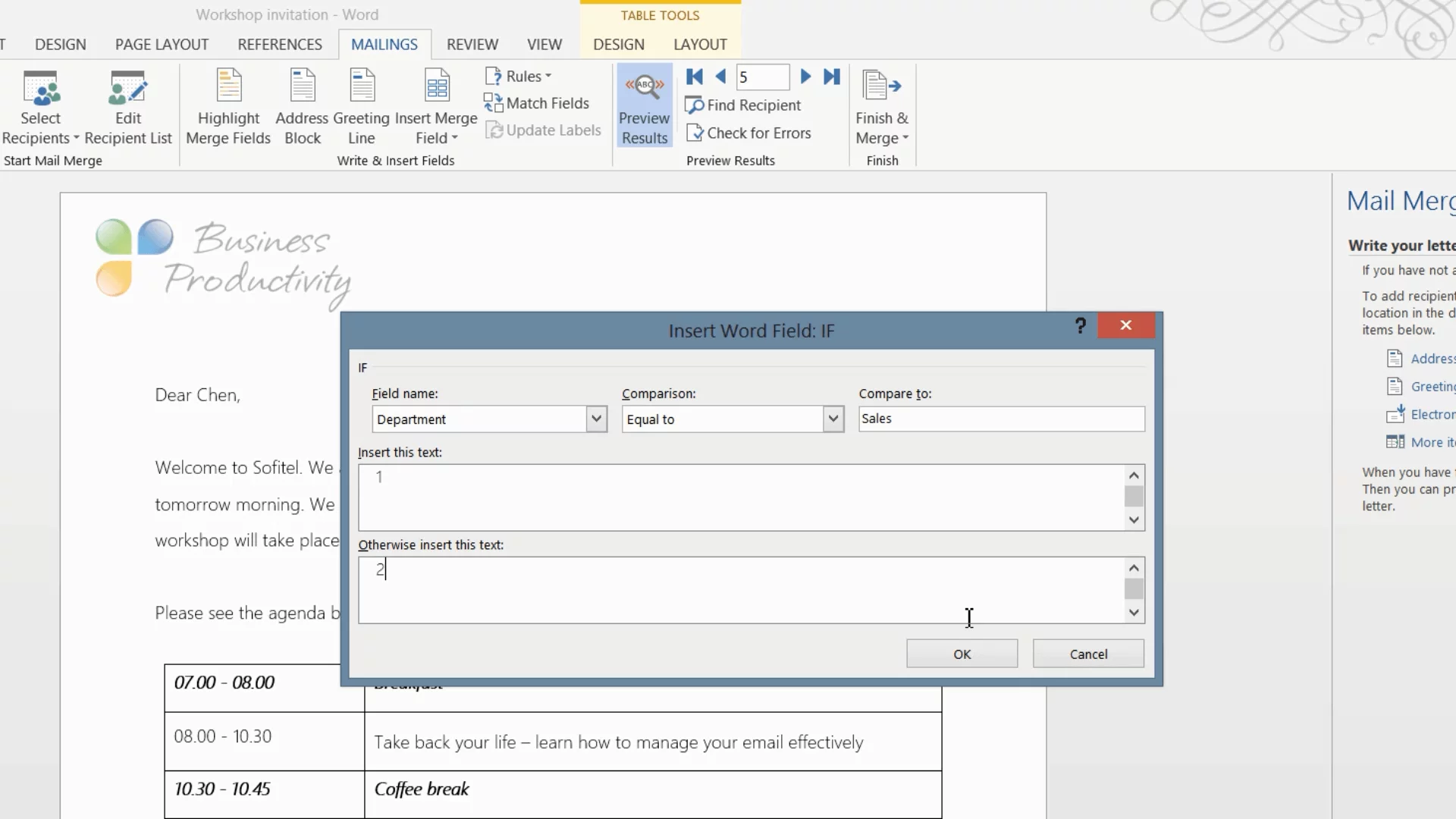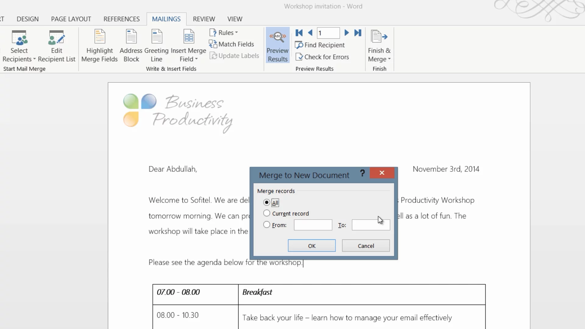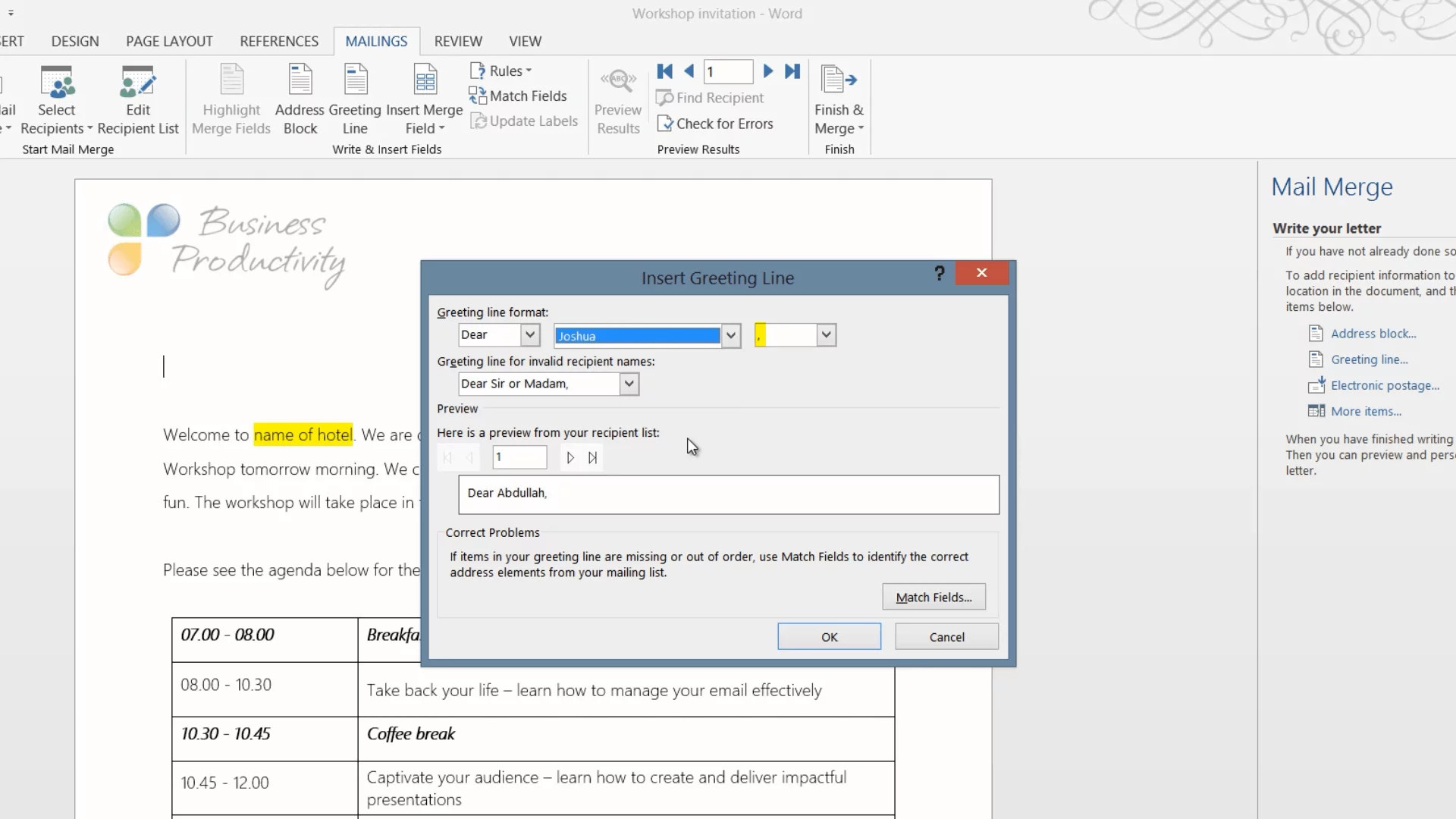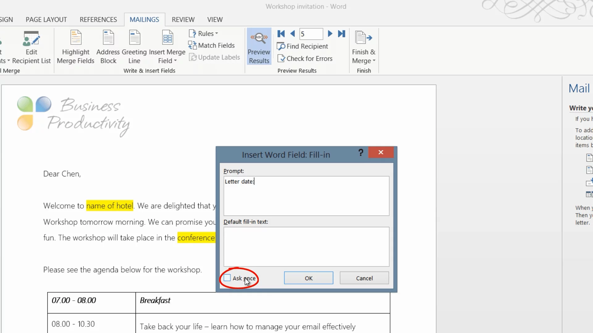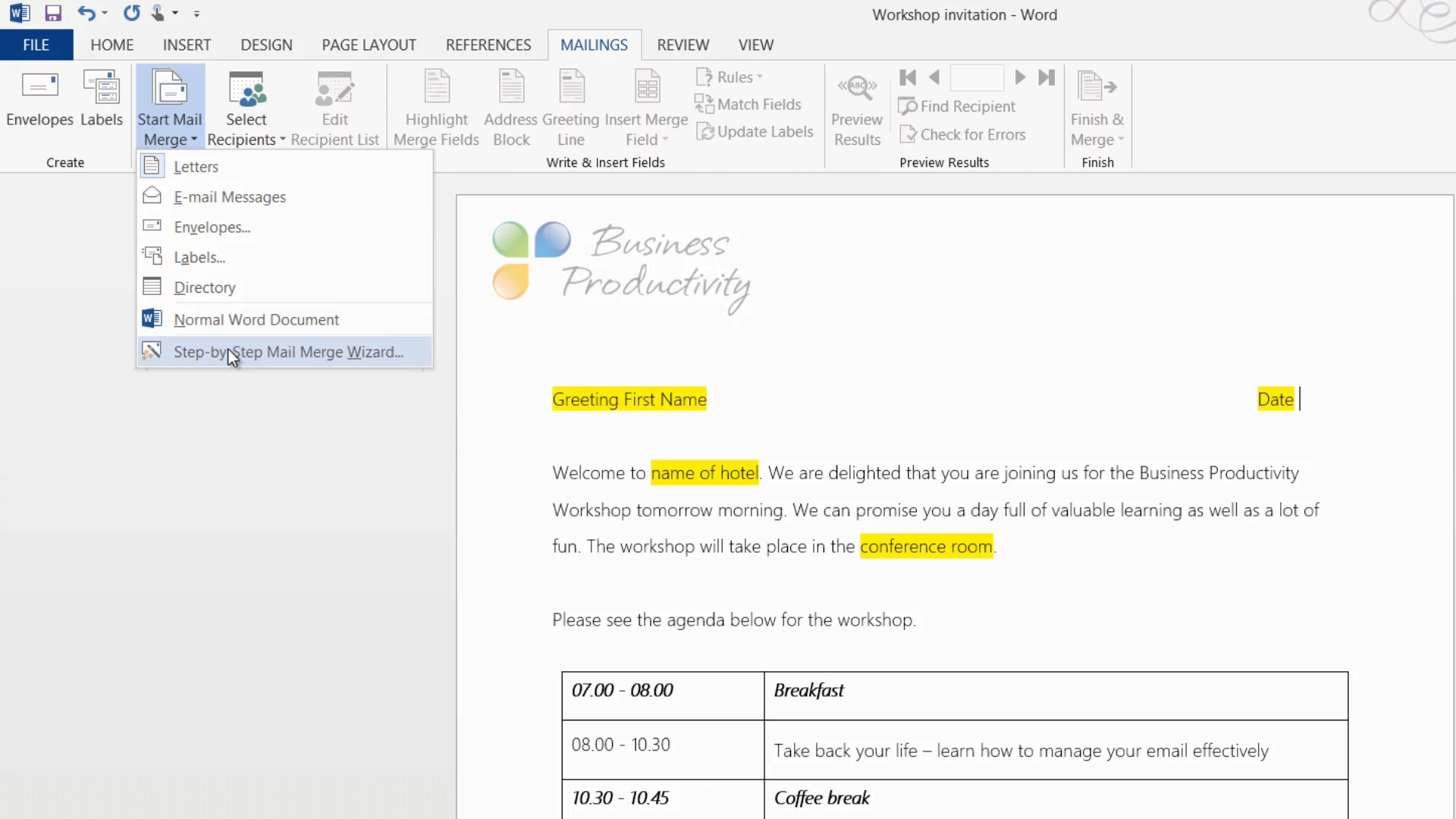 The letter will greet each participant by the first name. The date of the letter should be the date before the event. The name of the hotel and the conference room where the workshop will be held should also be added to the letter. I could just write in the date, hotel and conference room into the letter, but since I want to make this into a reusable template that we can use multiple times, I’ll add some flexibility here so that we can easily change this information next time we use the template.