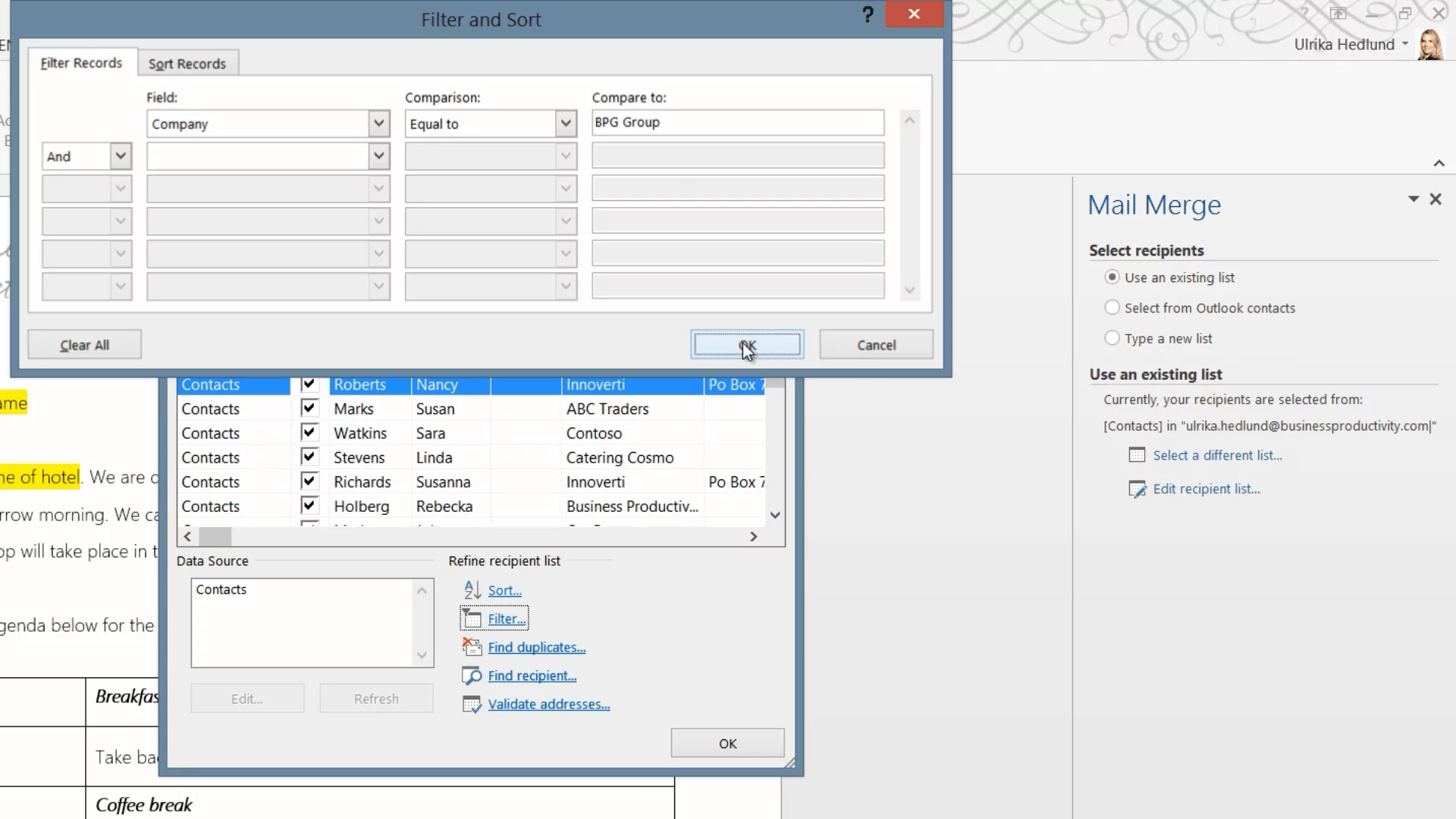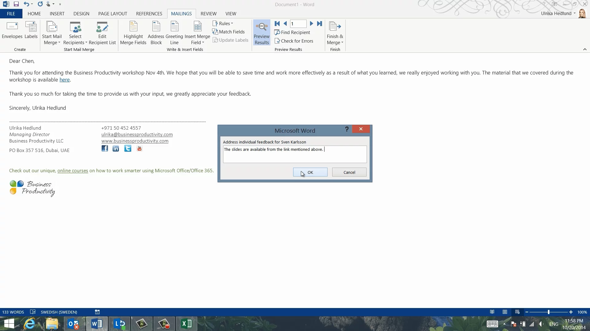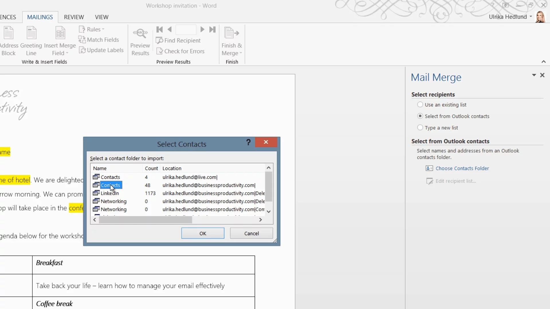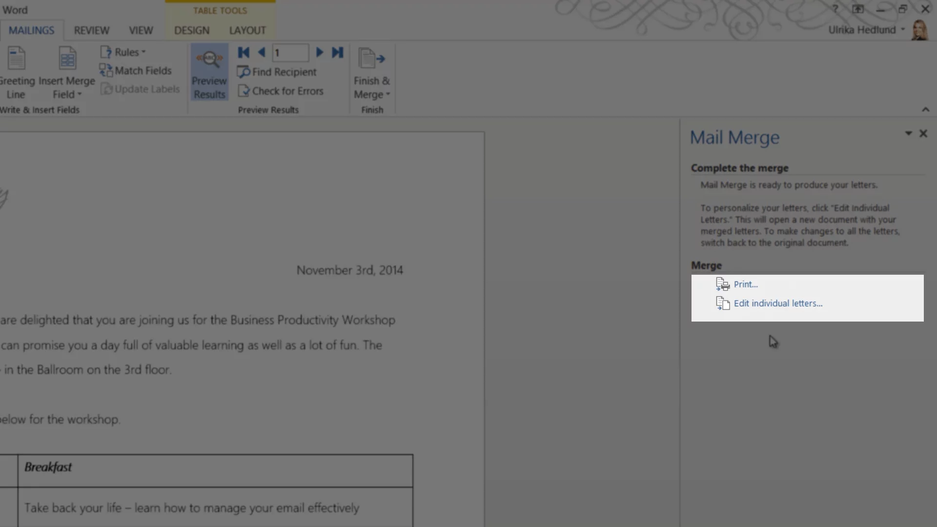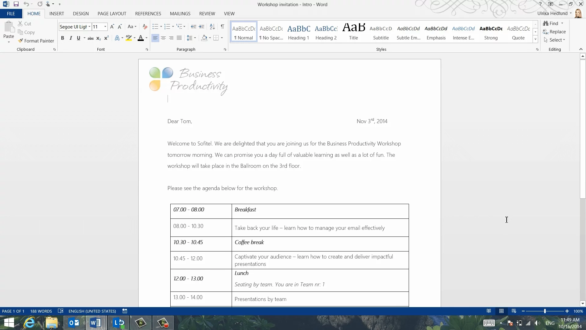 The letter will greet each participant by the first name. The date of the letter should be the date before the event. The name of the hotel and the conference room where the workshop will be held should also be added to the letter. I could just write in the date, hotel and conference room into the letter, but since I want to make this into a reusable template that we can use multiple times, I’ll add some flexibility here so that we can easily change this information next time we use the template.