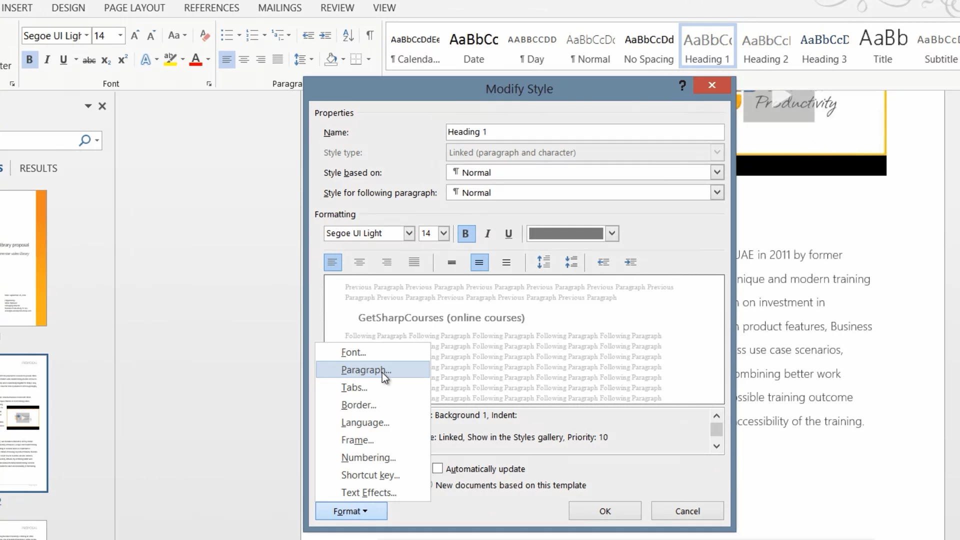 Now that I’ve inserted the video into my document I can see that the heading of the next paragraph is separated from the text itself. To keep all headings in your document with the paragraph, right-click the heading style and select “Modify”. Click “Format” and then “Paragraph”.