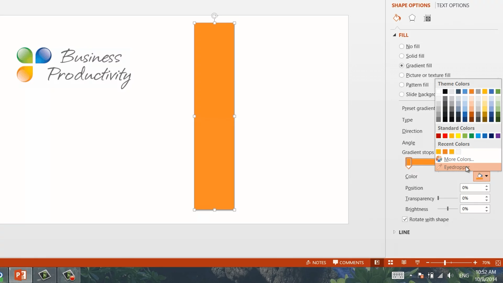 I want the remaining gradient stops to pick up colors from our logotype, but it can be quite difficult to pick these exact colors by just looking at the color chart. If you want to format your shape with the exact colors as your logo, you can use the Eyedropper tool in PowerPoint. Copy your logo and shape into PowerPoint. Select color for your gradient stop, and in the color drop down select the “Eyedropper”.