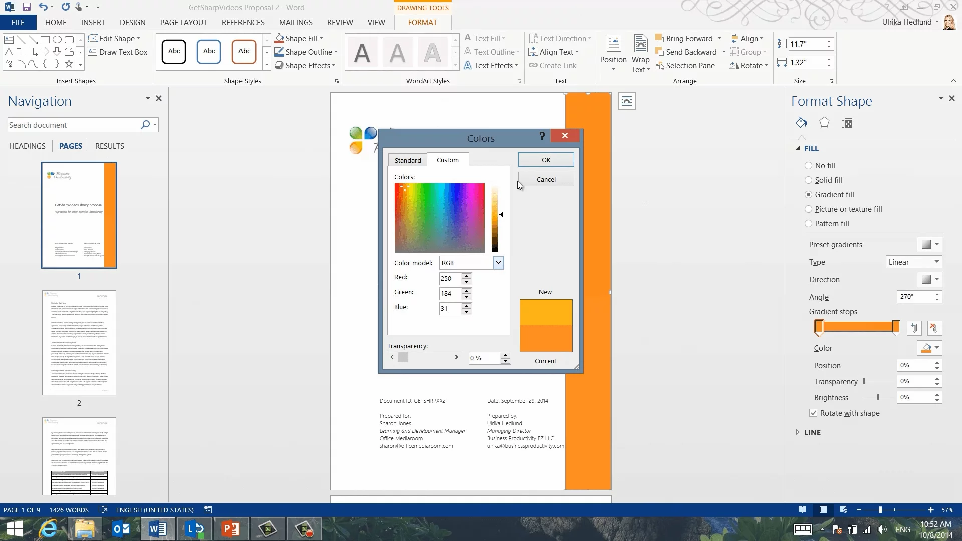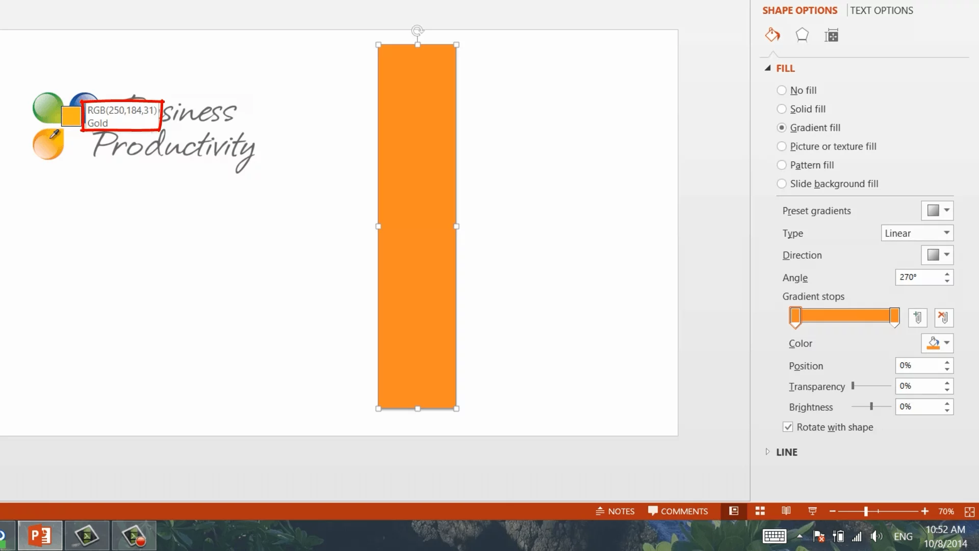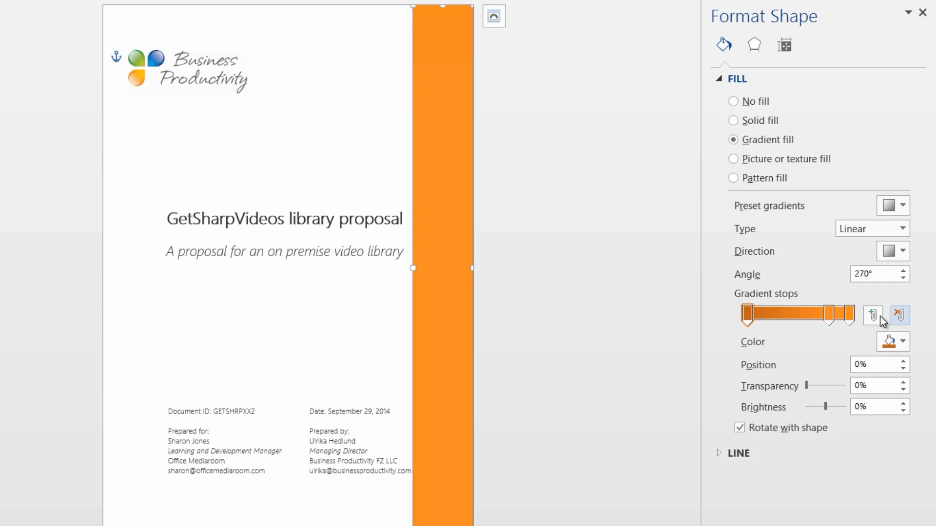 I’ll change the design and select a color that goes better with our logo. I’m not thrilled about the color of the shape, so I’ll open up the formatting panel by right-clicking the shape and selecting “Format Shape”. I’ll open up the “FILL” section and look at the Fill settings, here I’ll remove one of the “Gradient stops”.