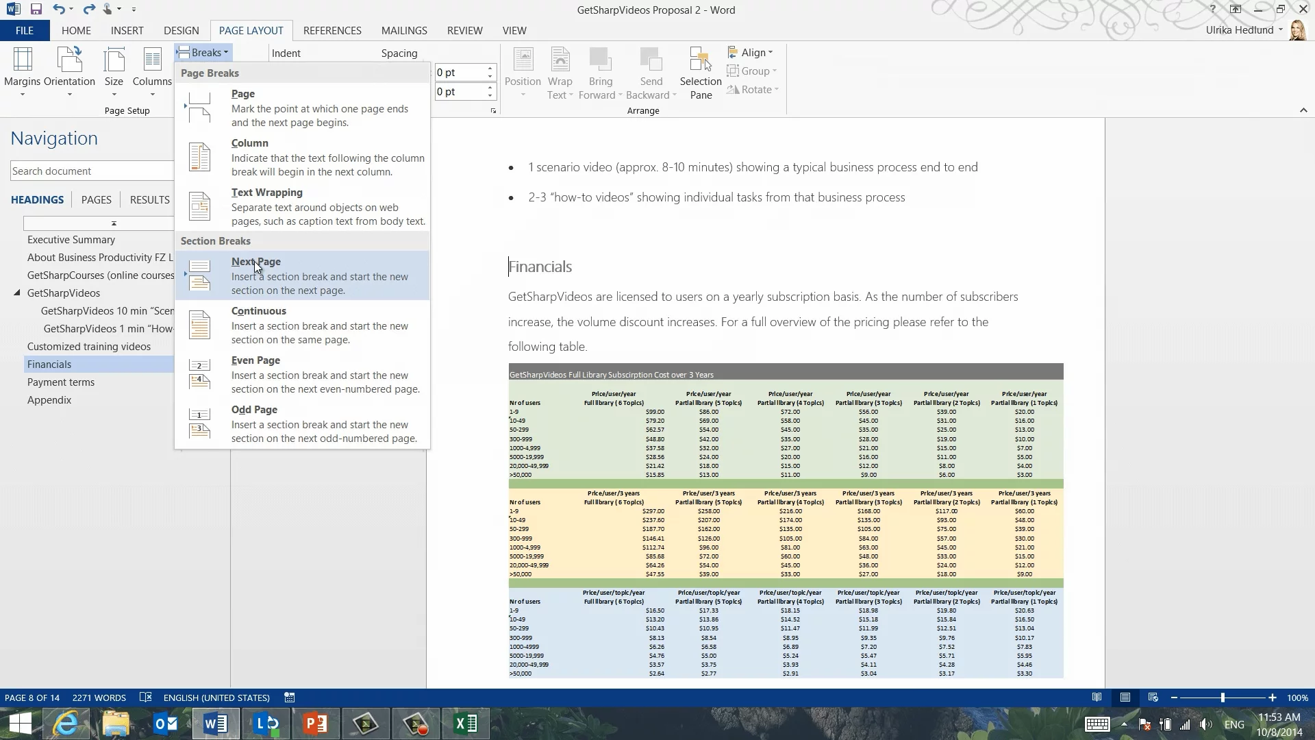To insert a single page in landscape mode, position your cursor where you want the landscape page to begin. I’ll place my marker at the start of the financial section. Click the “PAGE LAYOUT” tab, “Breaks” and then select a “Next Page” section break.