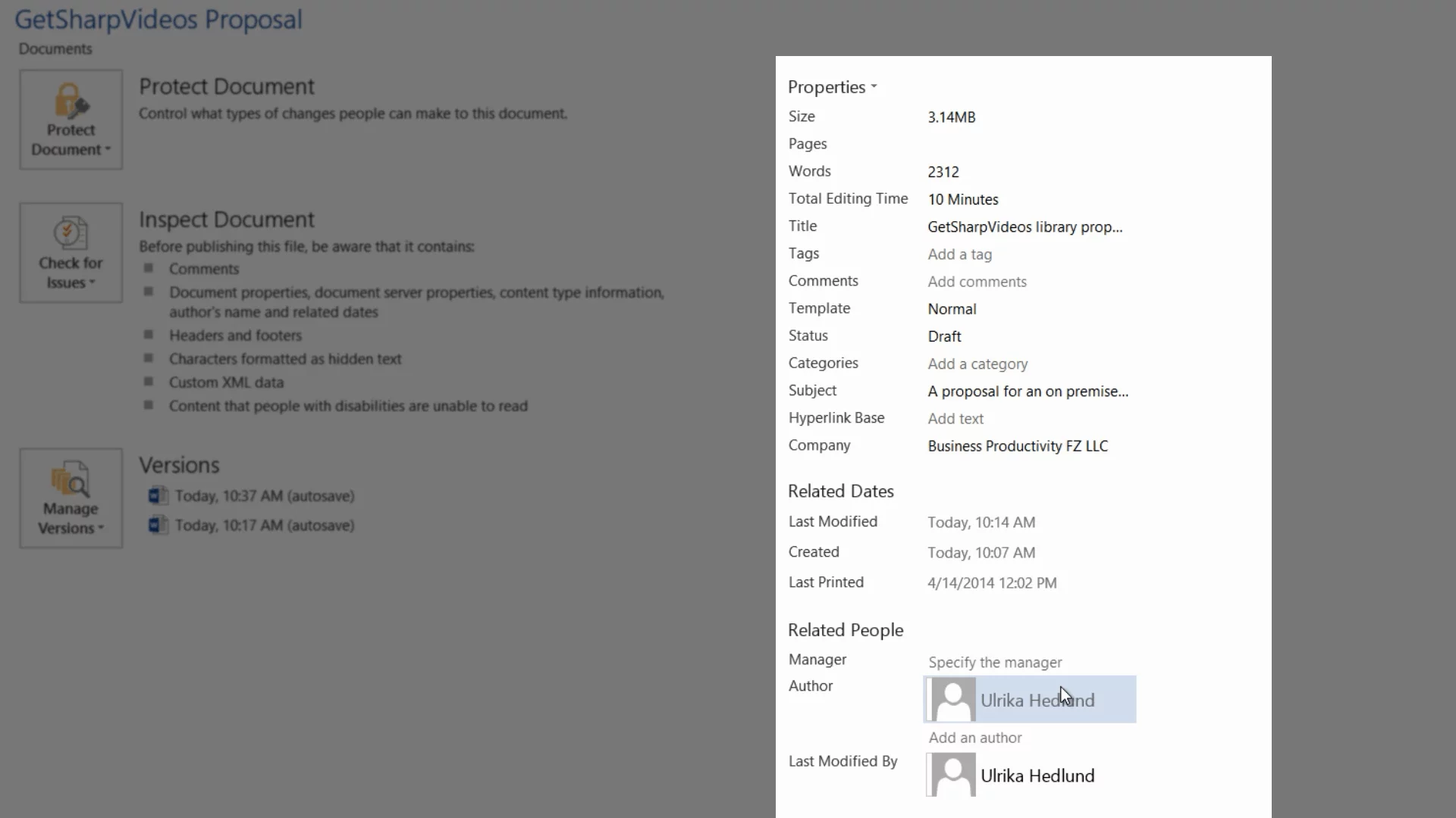 I’ll type in the name of our company, Business Productivity FZ LLC. If you click the “FILE” menu and expand the Document Properties you can see that our company name has been added to the document information.