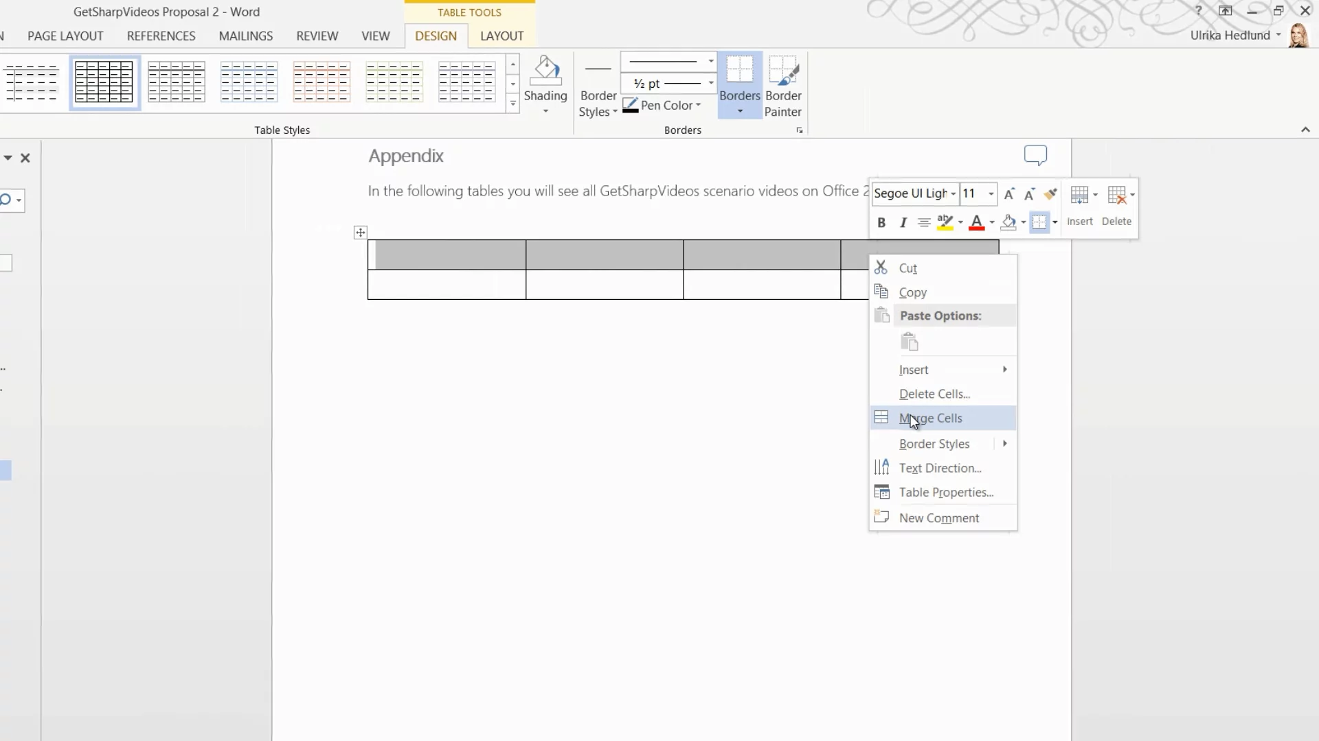 Next, I’ll write the table heading and then change the formatting. I’ll click “Shading” and change the color to grey, and then I’ll use the mini-toolbar to format the text. After that, I’ll add the column headings.