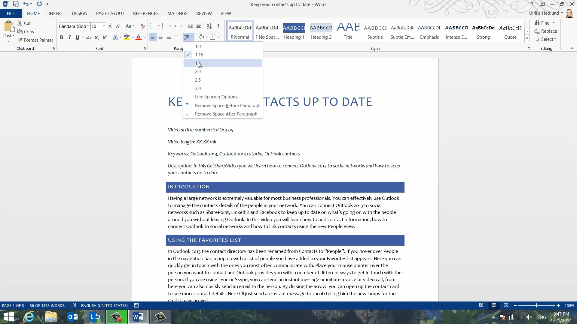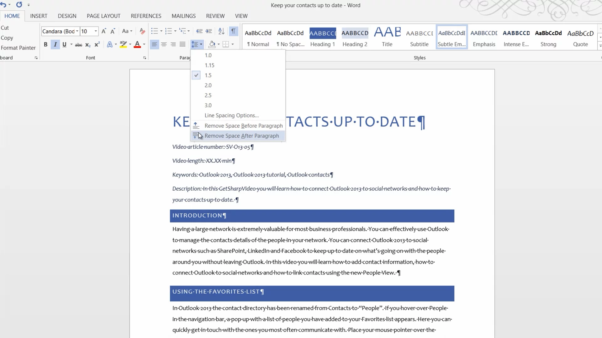 To make it even more compact I’ll click again and select “Remove Space Before Paragraph”. If I want it even tighter I can decrease the line spacing, but I prefer to have a bit more space so I’ll click undo twice. To save these changes to the style I’ll right-click the “Subtle emphasis” style and select to “Update Subtle Emphasis to Match Selection”.