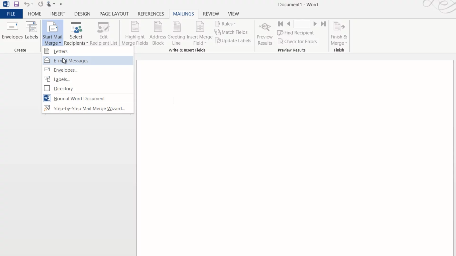Here is the welcome letter in Word. I’ve highlighted the fields that will vary in yellow. To start using Mail Merge, go to the “MAILINGS” tab and click “Start Mail Merge”, here you can select what type of document you want to create or if you want step by step guidance you can select the “Step-by-Step Mail Merge Wizard”.