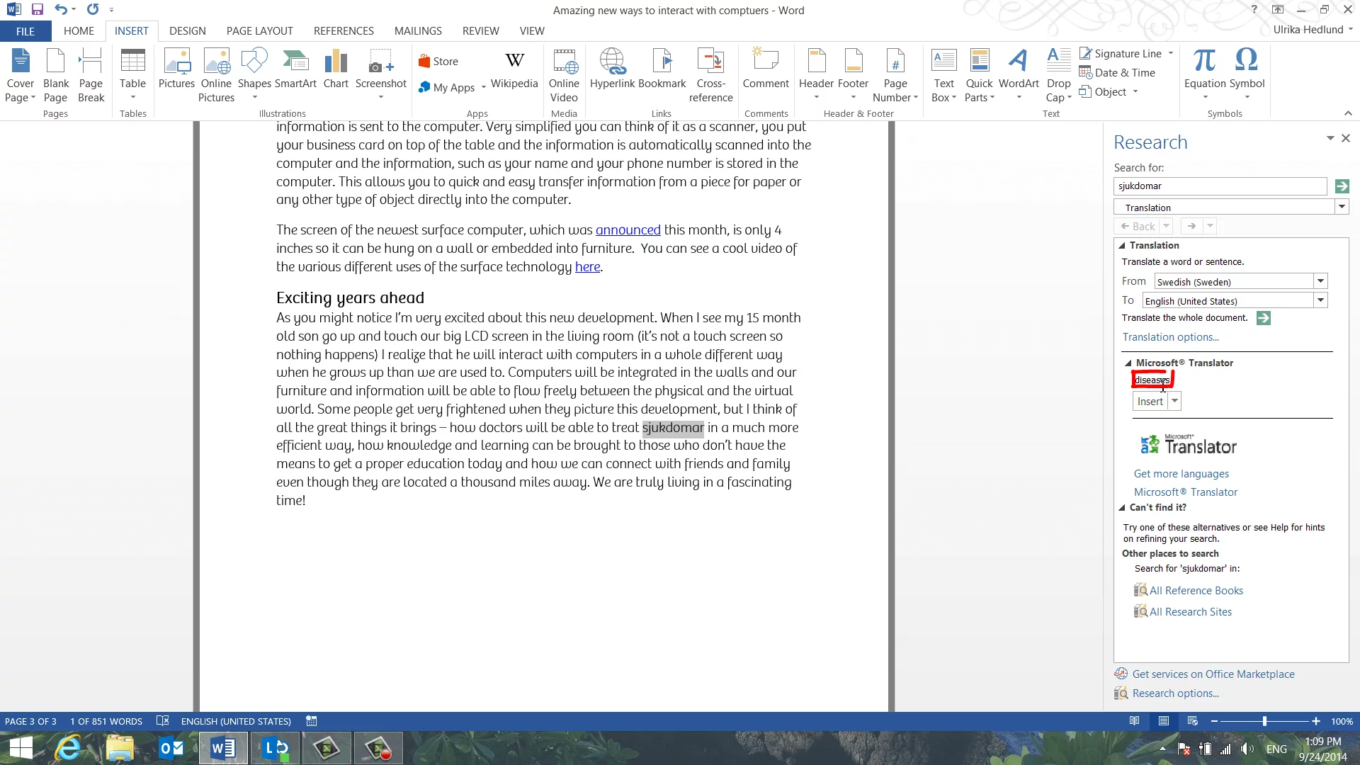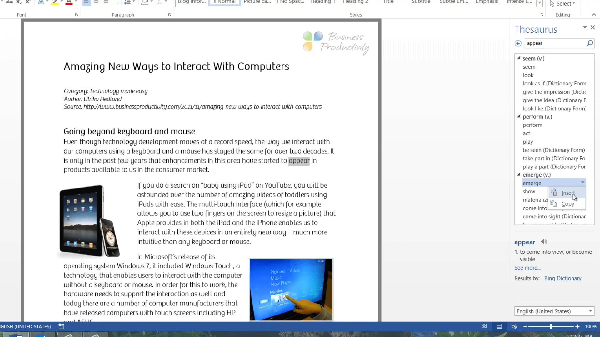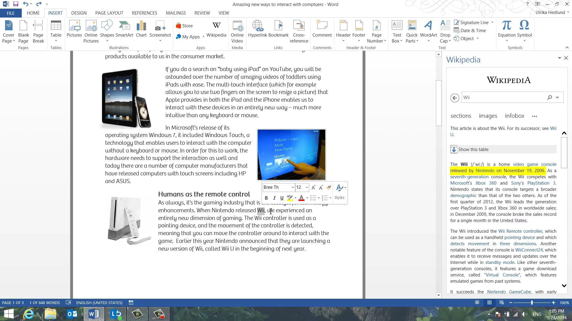 I’ll search for our video on YouTube. Select the video and click “Insert”. A thumbnail of the video is inserted into the document. I’ll change the layout options to wrap the image with text and position the video thumbnail where I want it in the paragraph. If the reader is online while reading the document he or she can play the video by just clicking the thumbnail image. By inserting a video into the document itself you don’t risk losing the reader’s attention by opening up another website.