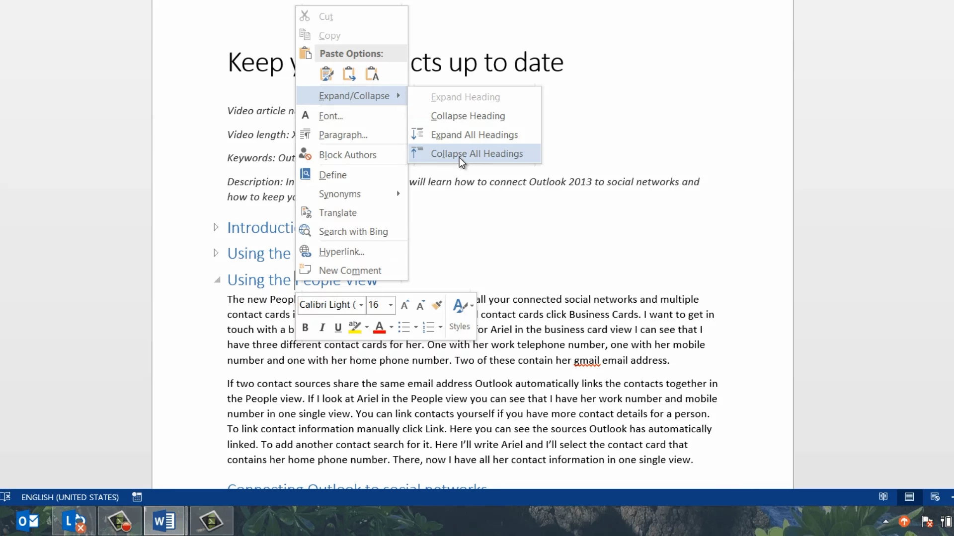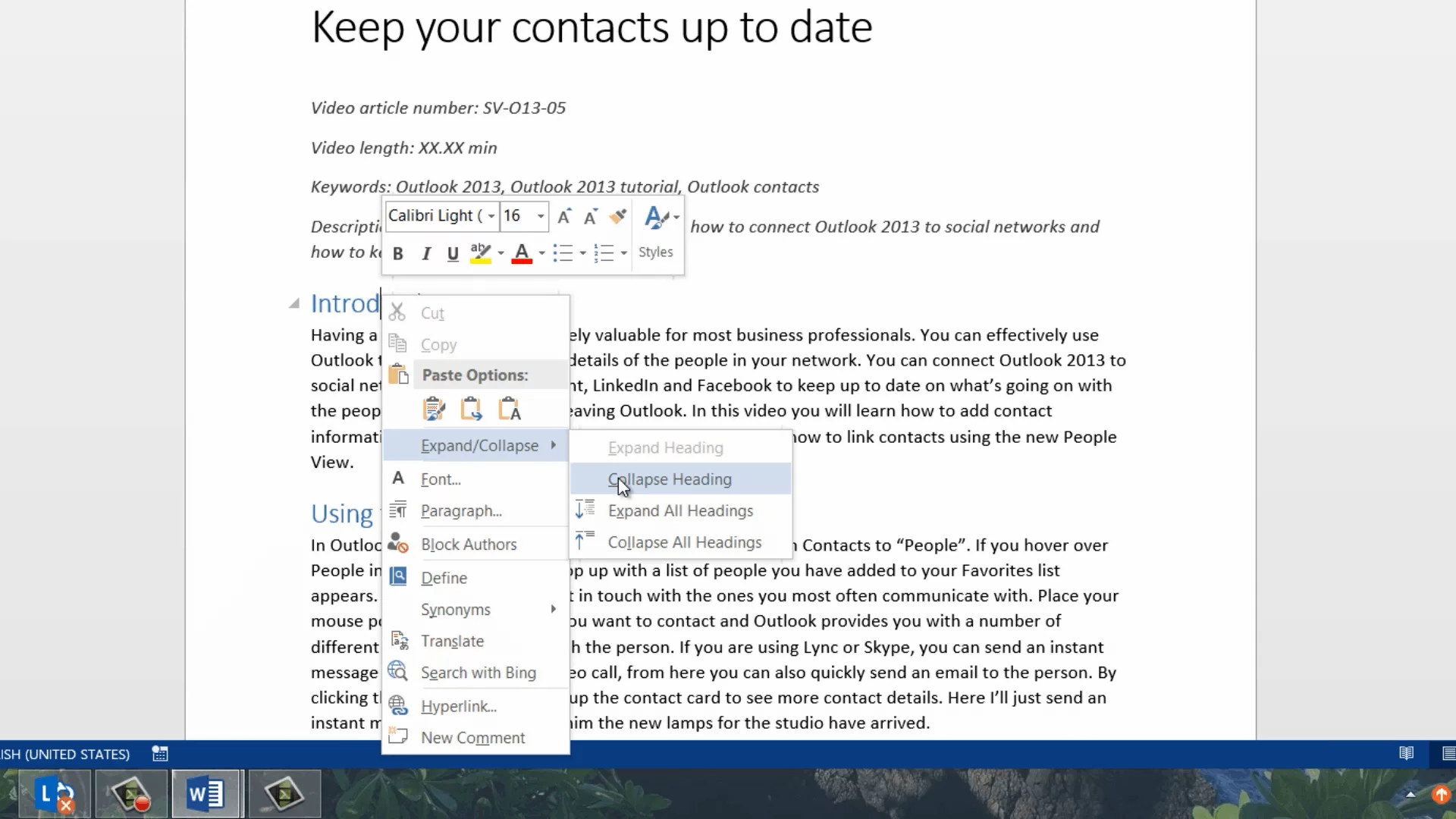 By applying heading styles it is much easier to navigate and work with the document. In Word 2013 I can get a good overview of the contents by collapsing and expanding the paragraphs. To collapse a paragraph place your cursor on the heading, right-click and select Expand/Collapse – Collapse Heading.