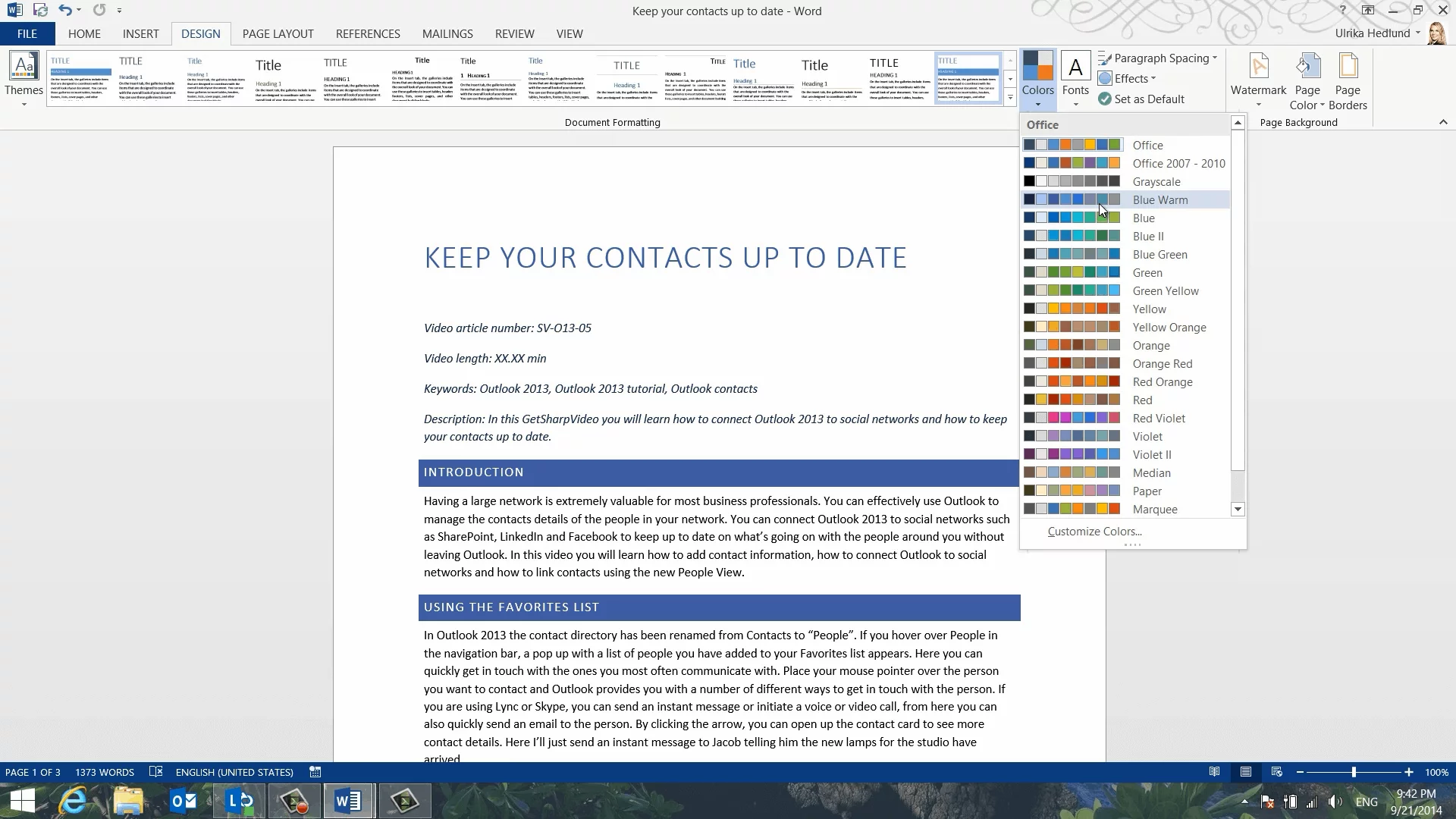 A style set is a combination of fonts, colors, and layouts. You get a live preview of what your document will look like using different style sets. I’ll select this “Shaded” style set. This is a good start but I want to make some changes. To change the colors used in the style, click “Colors”, and see which color combination you prefer.