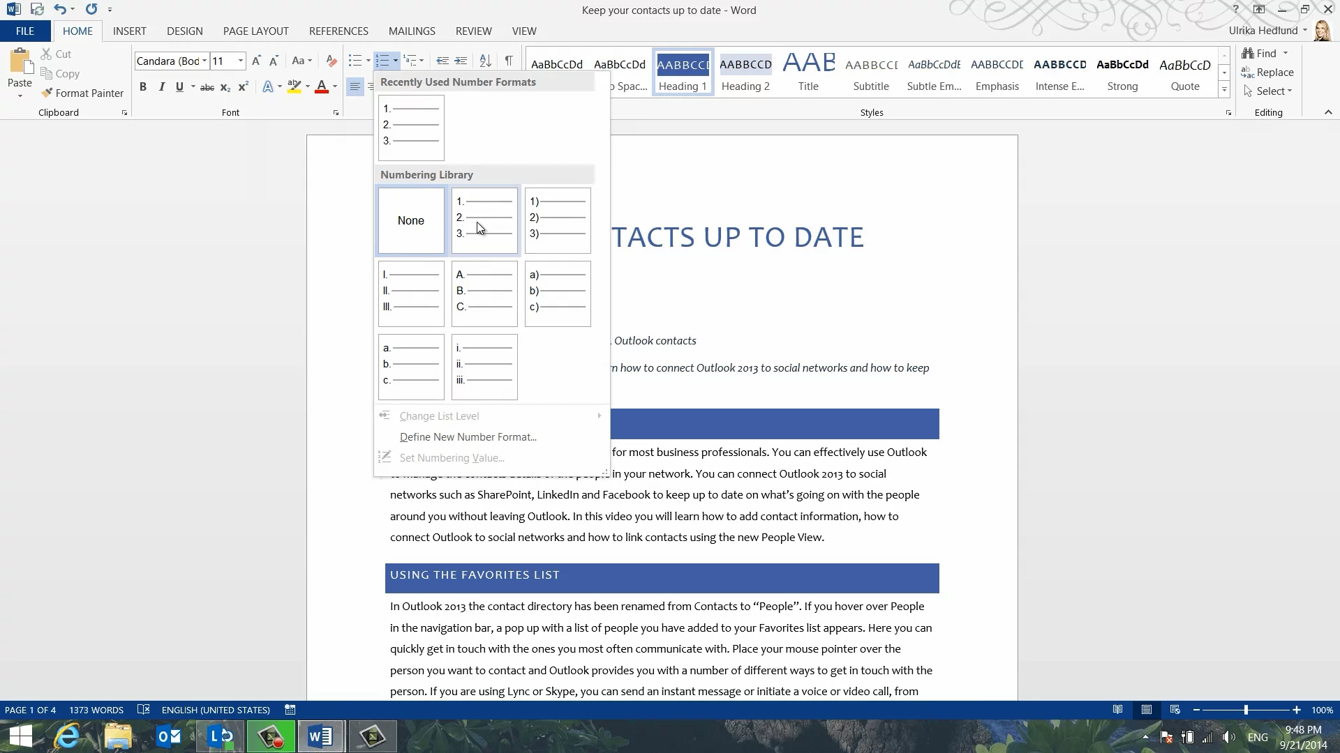 Next, I want to add heading numbers. To add numbers to your heading style, mark a heading and click “Numbering” in the Paragraph section of the “HOME” tab. Select a number format of your choice.