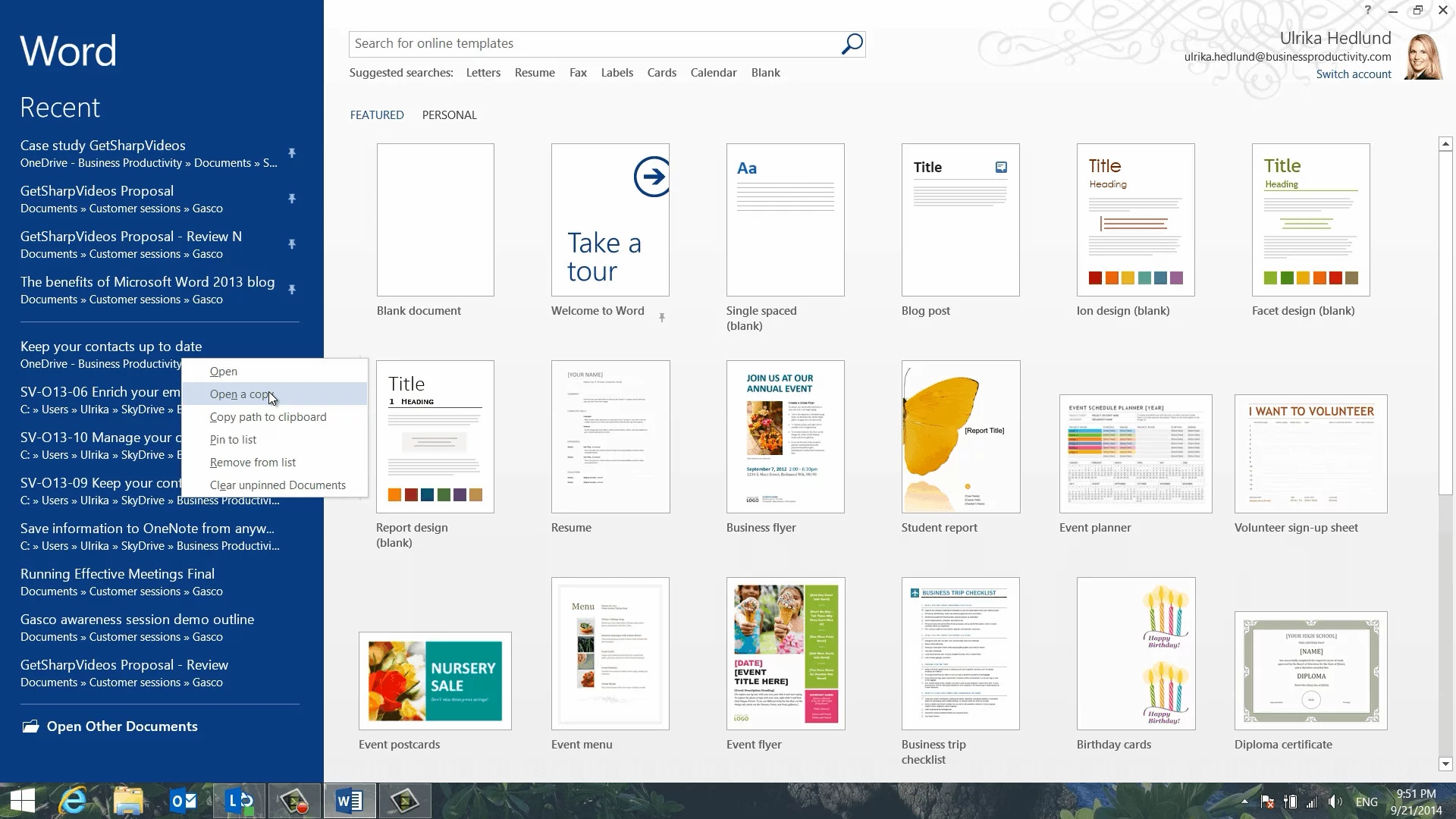 In addition to the formatting, this video script follows a certain text pattern. It has the article number at the top followed by the video length, keywords a description and then the actual script starts off with an introduction. A Style Set only saves the design, not the contents of the document. If you want to keep some of the text in your document it’s better to save it as a document template. To make sure I don’t overwrite my script by mistake I’ll close down the document. I’ll open up Word again and in the “Recent document” section I’ll right-click and select “Open a copy”.
