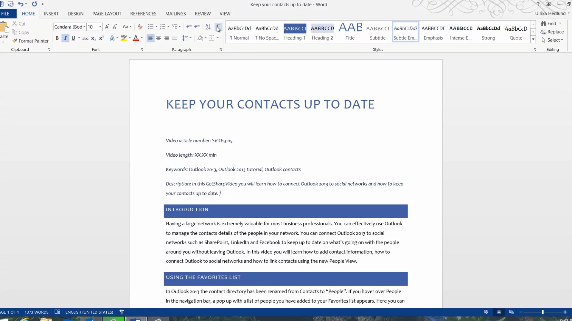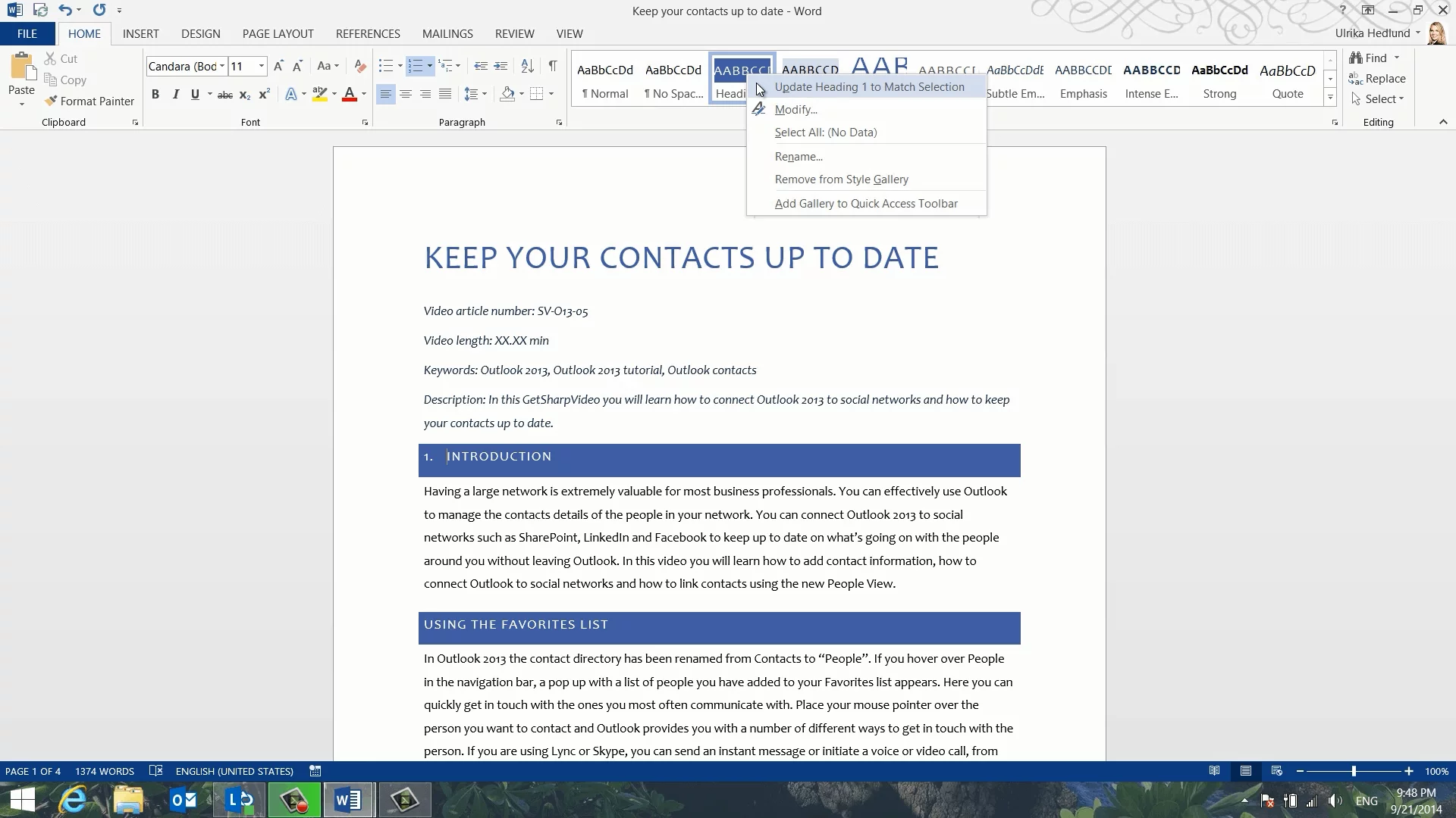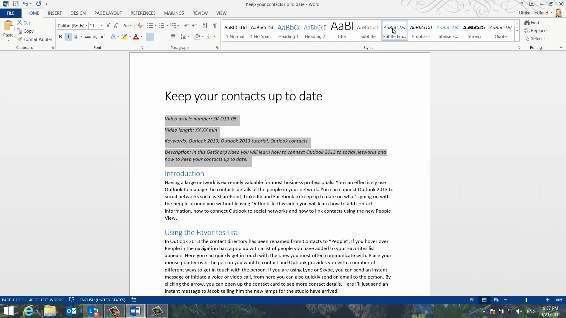 Next, I’ll write the outline for the script. The outline will also work as the headings for each paragraph. When I’ve written all the headings I’ll mark them and apply the “Heading 1” style. Now I’ll just write the text for each section and finally, I’ll add information about the video at the top. I’ll mark the informative text at the top and select to apply the “Subtle Emphasis” style.