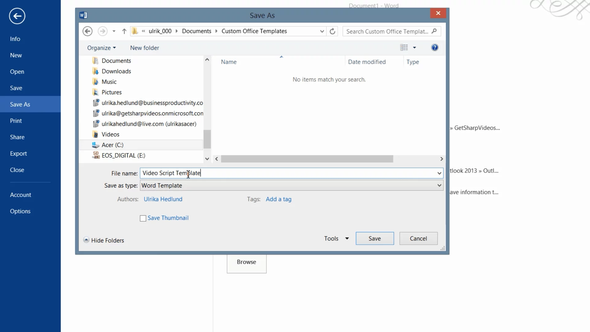 Now I’ll remove all the specific text and make it more generic. To save it as a template I’ll click “FILE”, “Save As” and then I’ll select “Word Template” in the file type drop down. I’ll give it a name, “Video Script Template”.