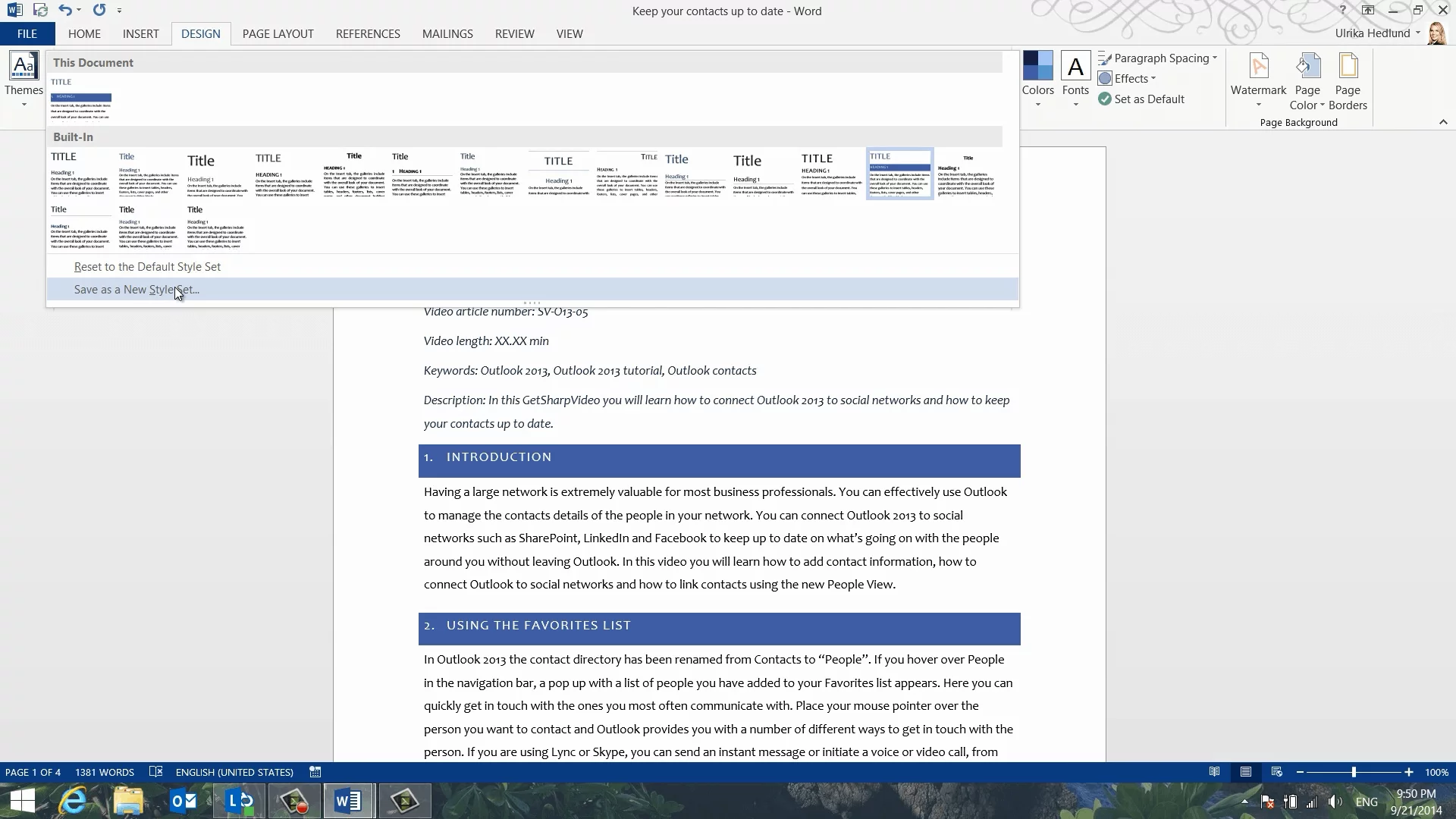 Now that I’m happy with all the formatting I want to save this style for future video scripts so that I don’t have to make the changes all over again. To save a style set go to the “DESIGN” tab, open up the Style Set Gallery and click “Save as a New Style Set”.