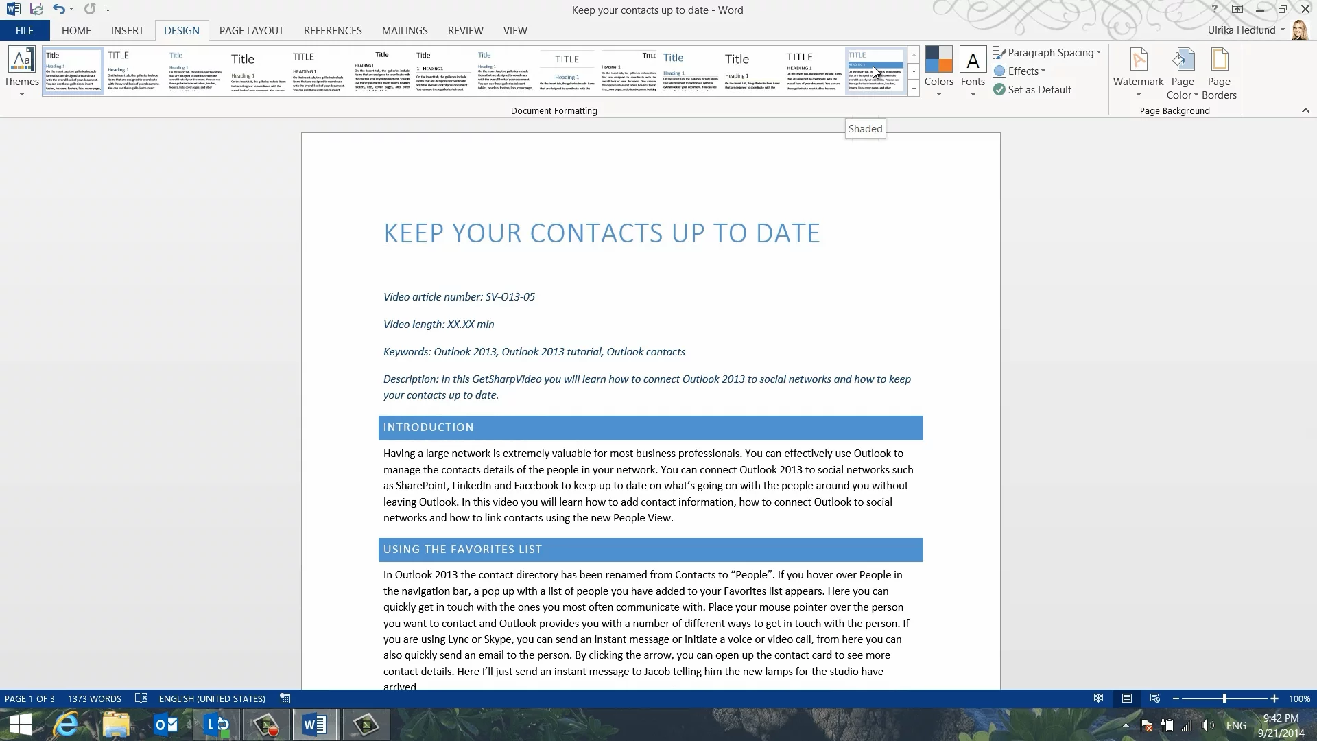 I’ll close down the “Navigation Pane”, and now I want to work on the look and feel of the document. To make it easier to change formatting, Word has a number of built-in style sets that you can use. To apply a style set to your document, click the “DESIGN” tab and select a style from the style set gallery.