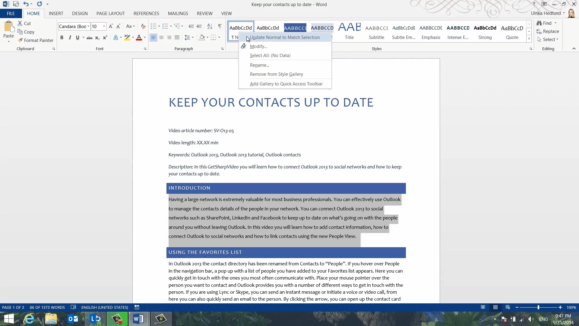 To apply this change to the entire document, I’ll right-click the “Normal” style used for the text and select “Update Normal to Match Selection”.